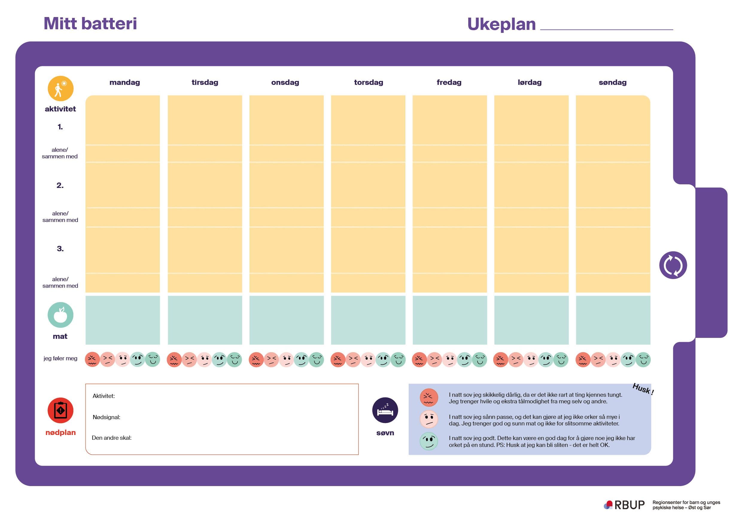 Med verktøyet Mitt batteri kan man få eksempler på ting man kan gjøre som gir små pauser fra stresset man opplever. Deretter kan man lage en ukeplan som kan hjelpe til med å gjennomføre de aktivitetene man tror kan gi litt pause. Ukeplanen gir også mulighet til planlegge aktiviteter sammen med andre og til å vurdere om aktiviteten opplevdes nyttig eller ikke. Mat og søvn er viktig når man har det vanskelig. Planen oppfordrer til å spise noe man synes er godt og sunt, og gir små påminnelser om søvn.