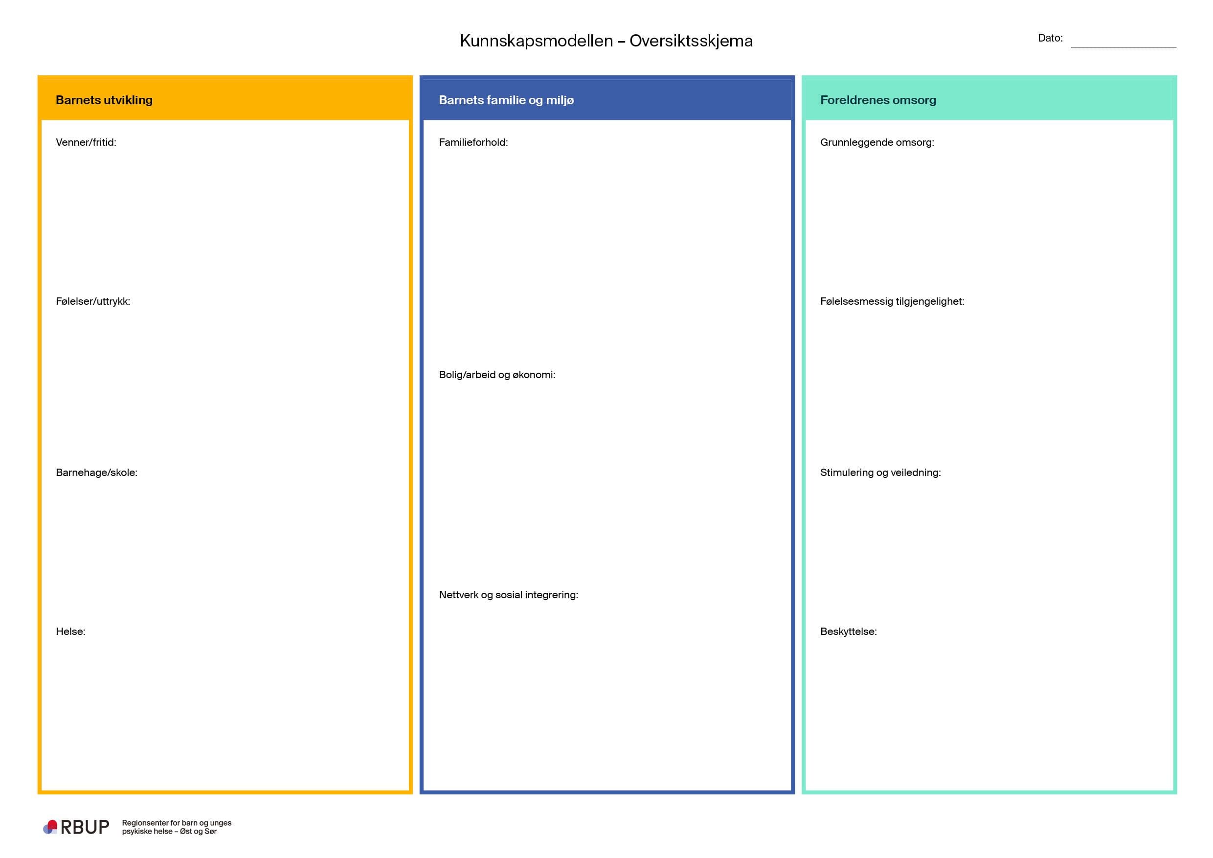 Skjemaet bygger på de tre hoveddimensjonene i Kunnskapsmodellen – barnets behov i sentrum. Disse er delt inn i elleve temaer, som igjen består av viktige delområder du som fagperson bør kartlegge. Skjemaet hjelper deg å samle inn og organisere informasjon på en strukturert måte, slik at du lettere kan se både barnets behov og hvilke ressurser/beskyttelsesforhold og belastninger/risikoforhold som er til stede.
