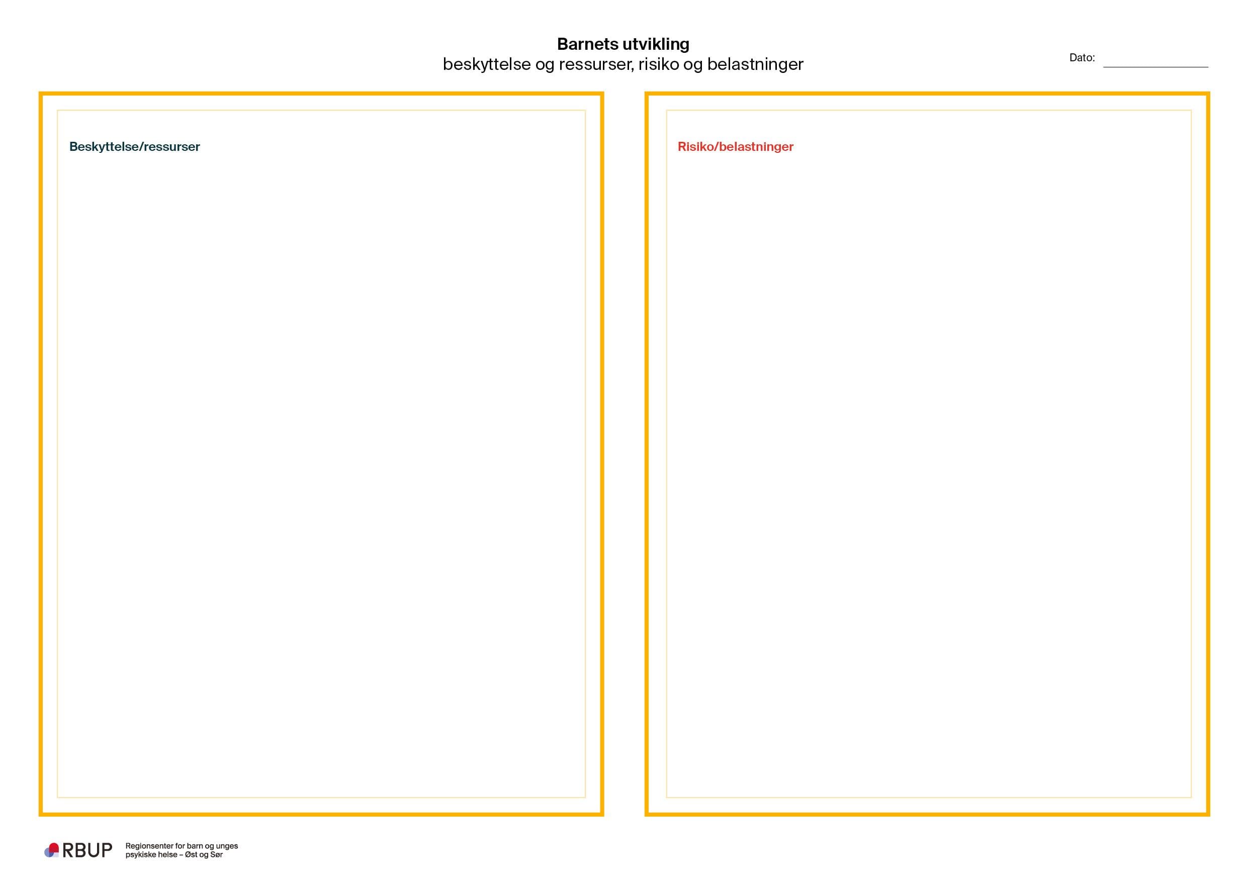 Her kan du systematisere det du har funnet under hver dimensjon ved å sette ressurser/beskyttelse og belastninger/risiko opp mot hverandre. Dette gir deg en visuell og balansert oversikt som kan gjøre det lettere å se helheten, vurdere behov for tiltak og formidle vurderingene tydelig i samarbeid med andre.