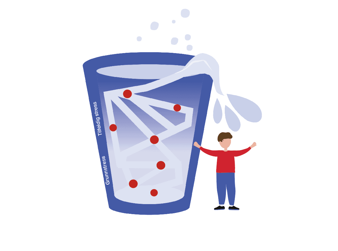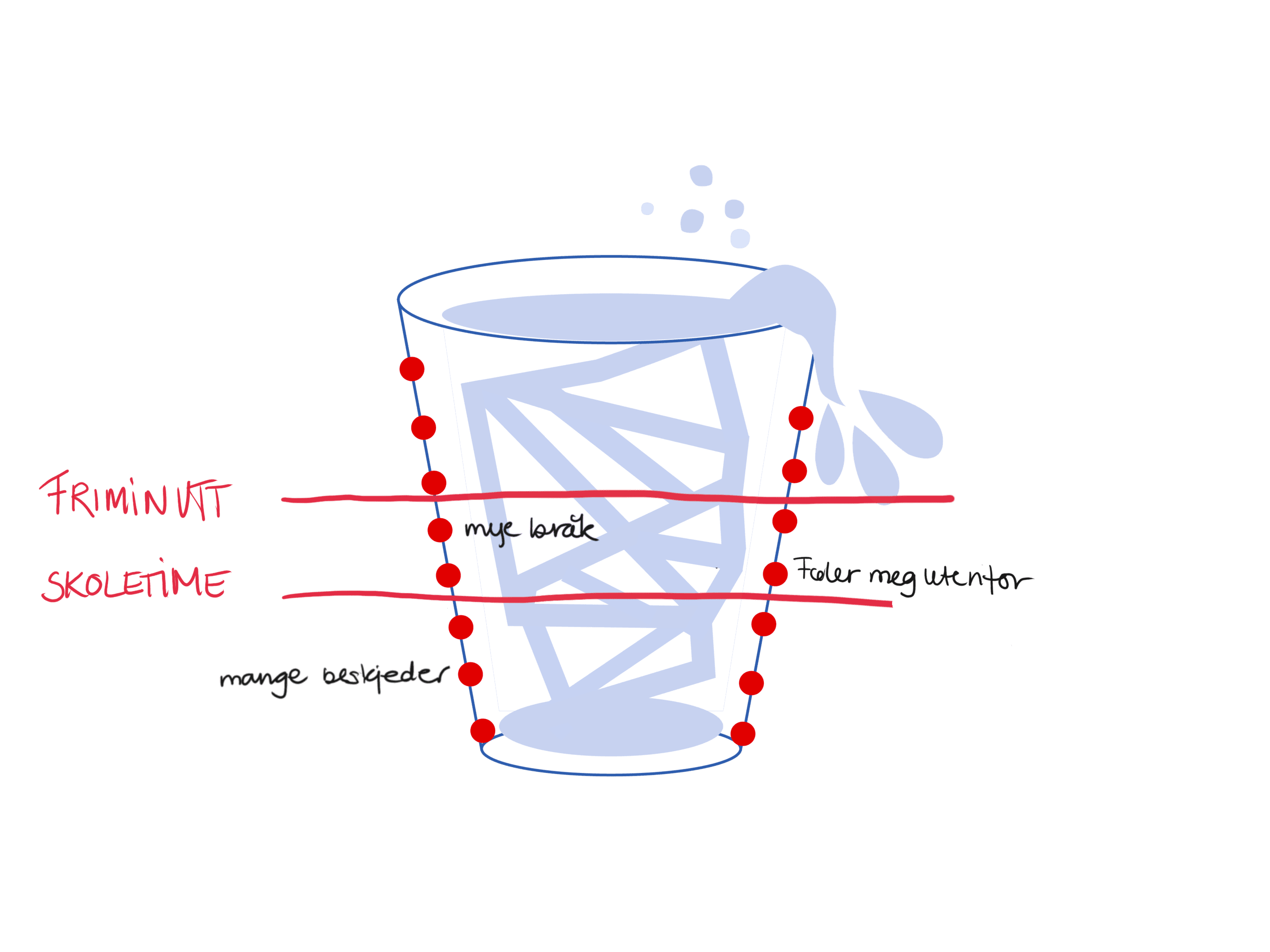 Når du hele tiden går med en stressaktivering – at glasset er halvfullt pga. grunnstress, så skal det ikke så mye til før begeret renner over. Det kan være en tilfeldig endring i dagsplanen eller en krangel i friminuttet. Og hvordan ser vi at begeret rennet over? Det er veldig ulikt - for noen kan det være utmattelse og akutt slitenhet, for andre angst, og for atter andre aggresjonsutbrudd eller utagering.