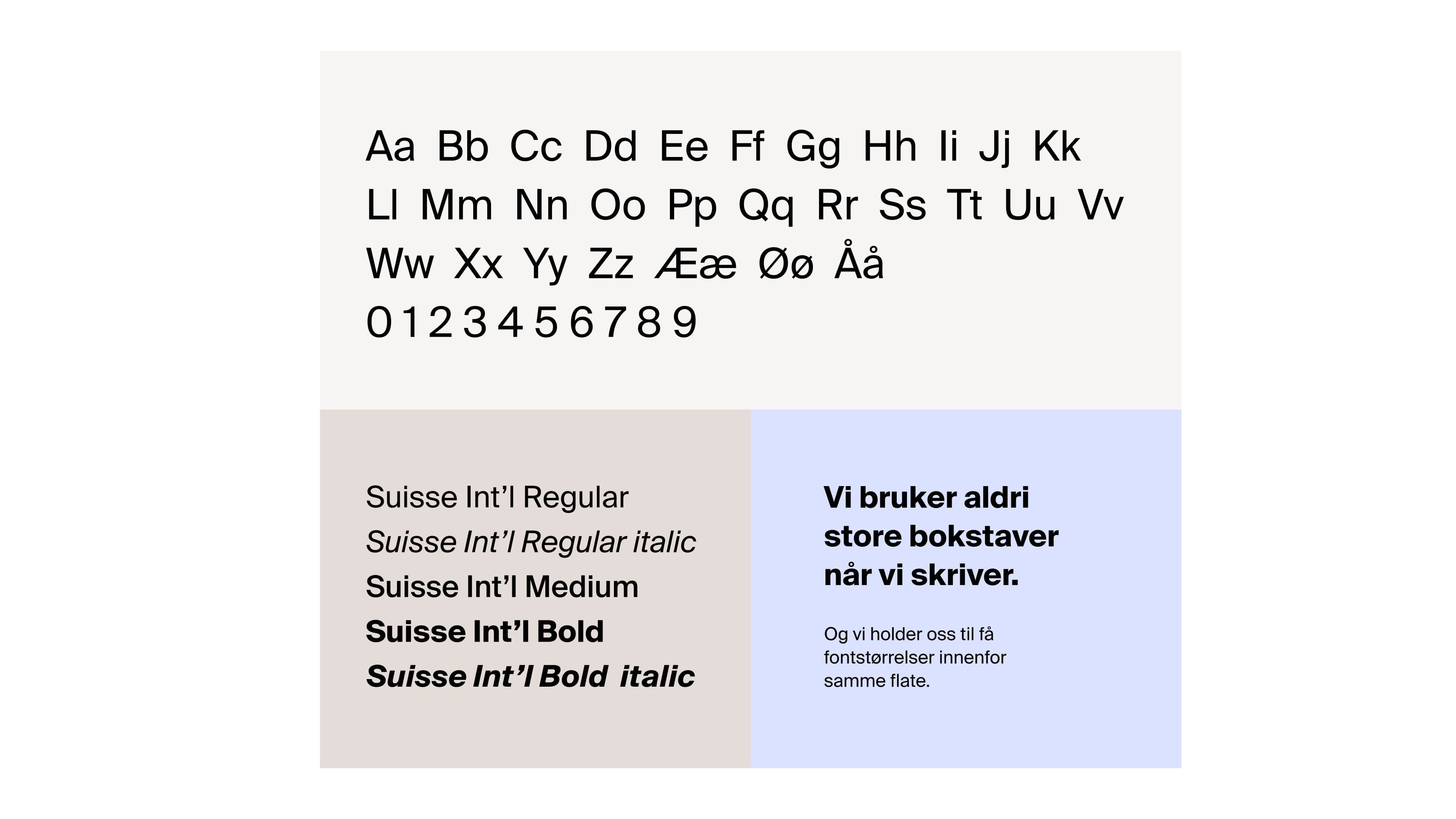 Sørg for at det kun benyttes de fonter beskrevet i denne designmanualen. Husk at antall fontstørrelser på samme flate holdes på et minimum.
